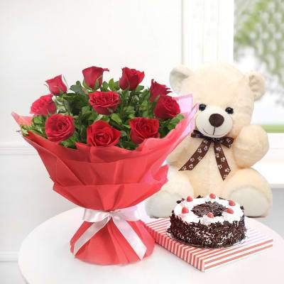-10 Red Rose in Red Paper Packing -10 inch Teddybear ( Any Available Colour ) -500g EGGLESS Blackforest Cake